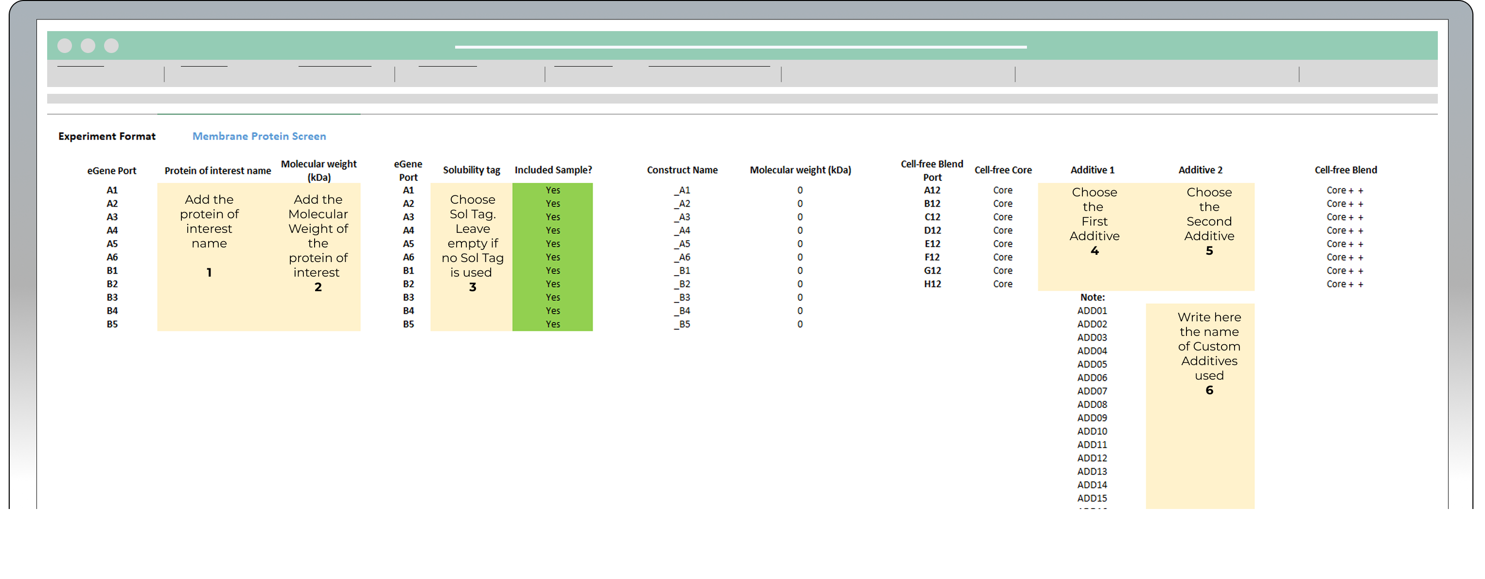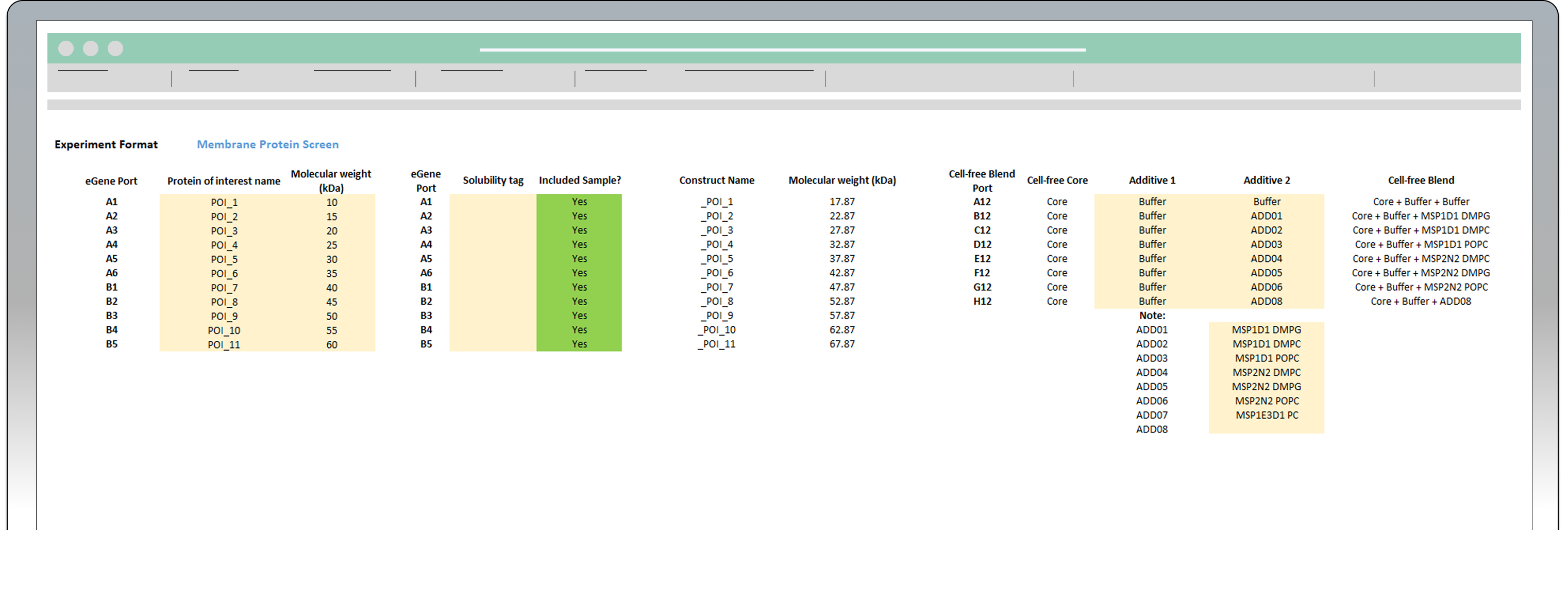 In this sheet you will design your experiment by adding the combinations of proteins of interest (POI), solubility tags and additives selected for the experiment. Enter the requested information in the cells highlighted in yellow (see image below)