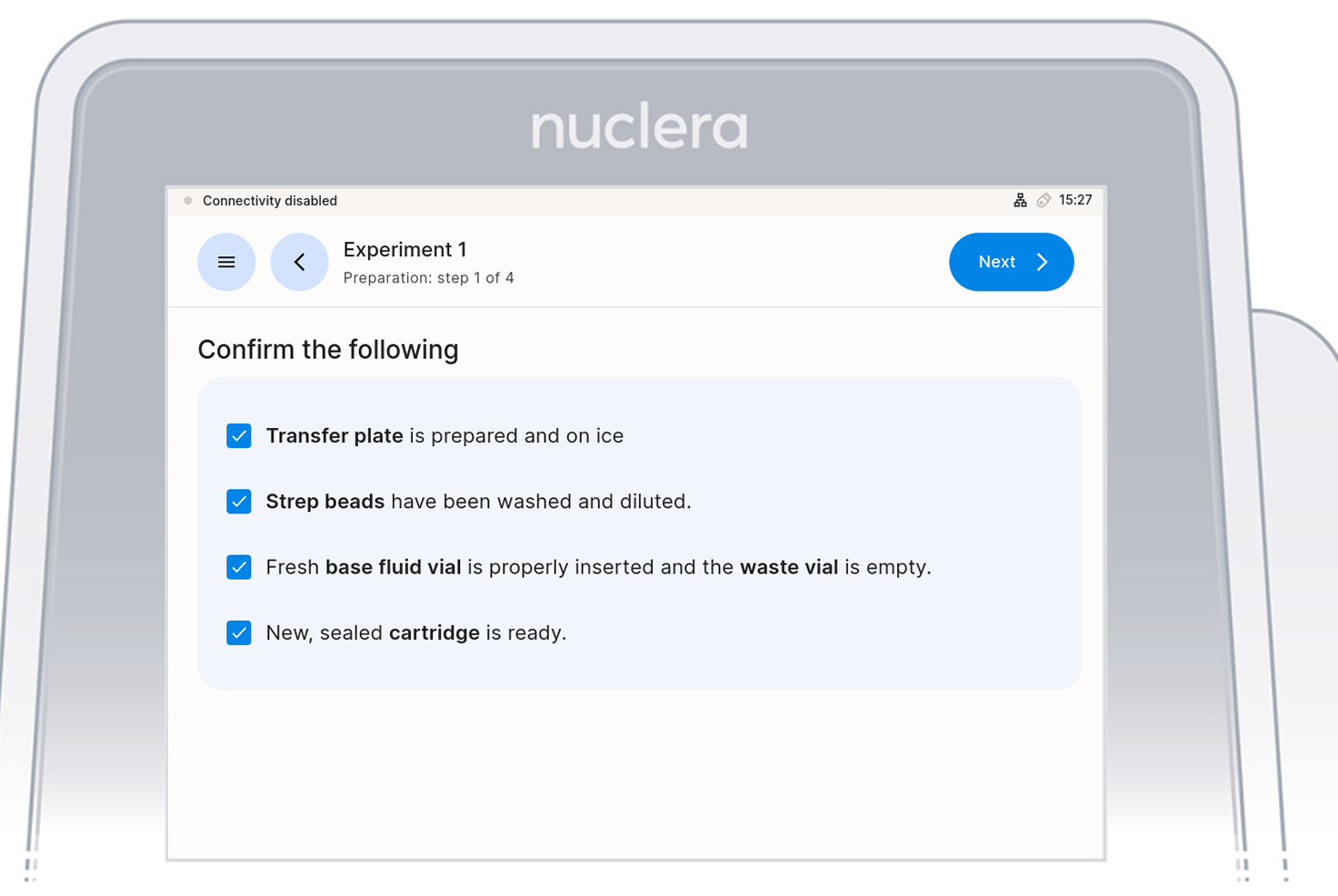 Depending if the user is operating on a Standalone system or on a Cloud Connected System, the first few steps of the experiment to carry out on the instrumennt will change. Select the appropriate tab for your use