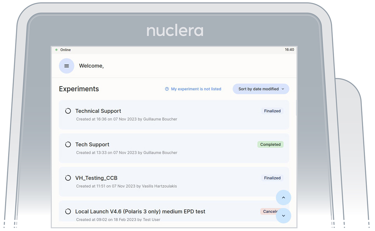 Instrument software welcome page with the list of finalized experiments