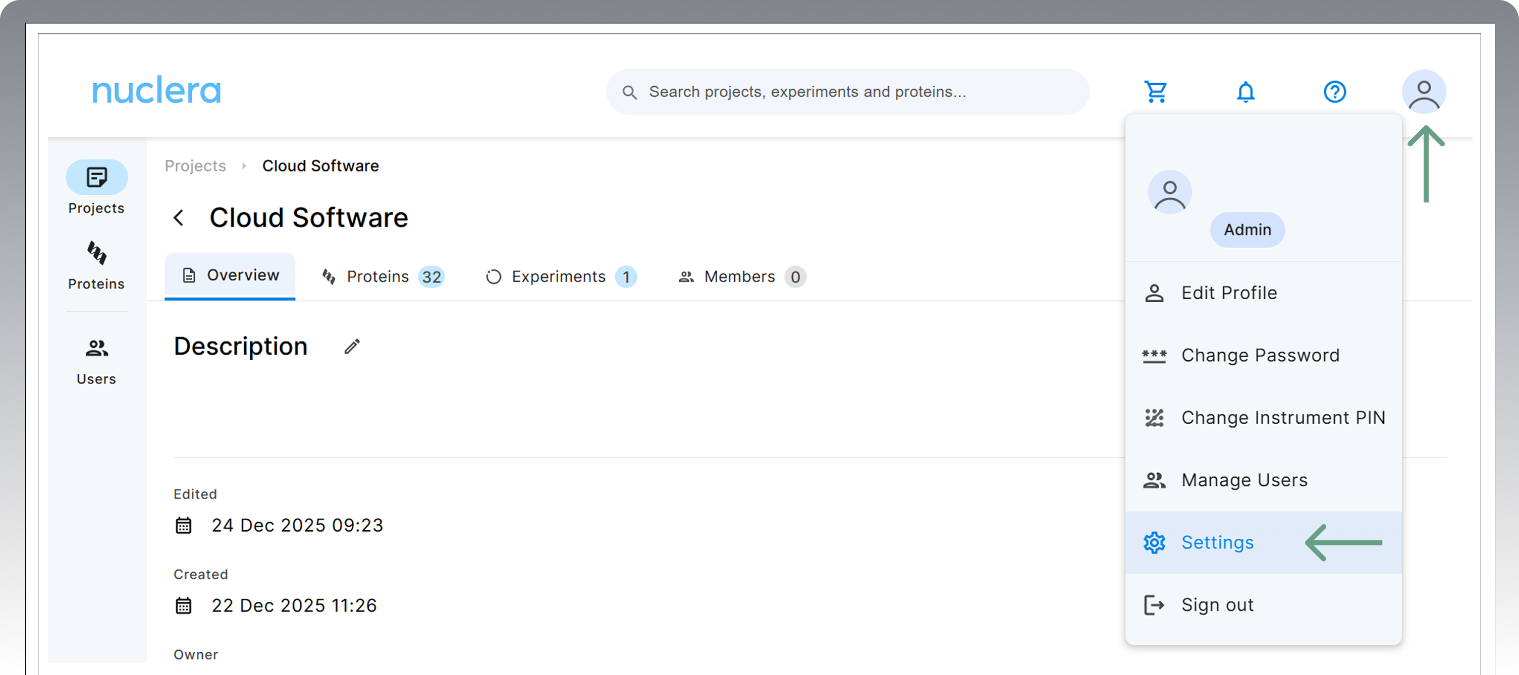 Access your Cloud Software account, click the profile icon on the top right-hand side, and select “Settings".