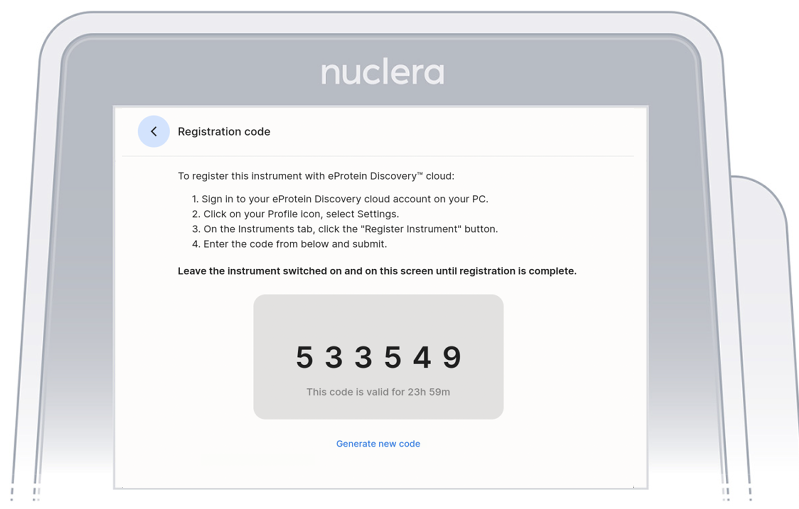 Once all the connectivity checks have been successfully completed, your eProtein Discovery instrument is ready to be registered to a specific tenant on the Cloud Software, using the registration code displayed on the instrument's screen. Note down the registration code provided and enter it on the Cloud Software from your computer within 24 hours of receiving this code.