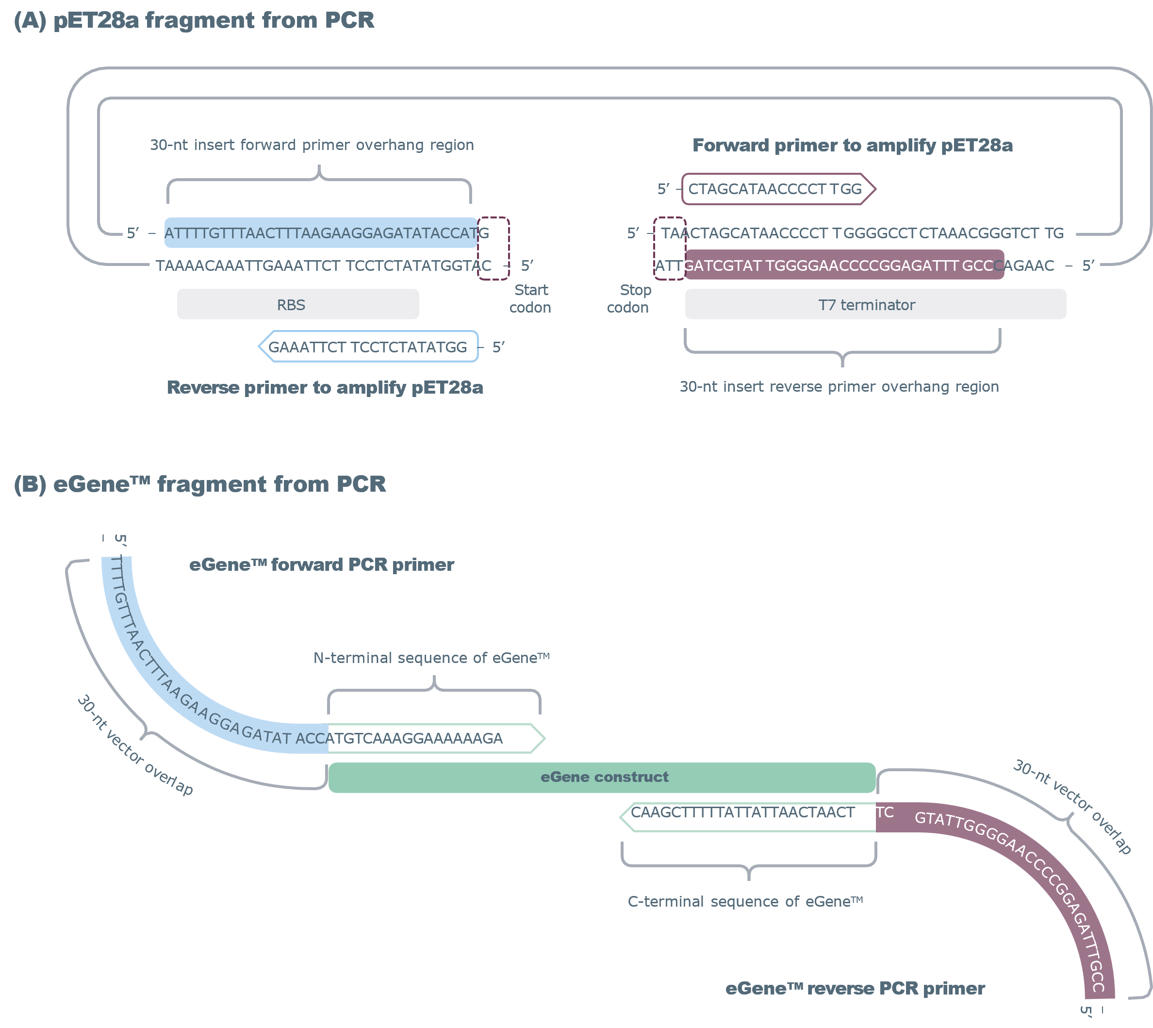 For Gibson Assembly®, consider the vector and insert as two fragments to be joined seamlessly into a circular plasmid. Therefore, two sets of primers (and two PCR reactions) will be required to amplify the expression vector and eGene™ selected. Below are guidelines for designing primers to amplify the vector and eGene™ insert. See Figure 1 for an example with pET28a.